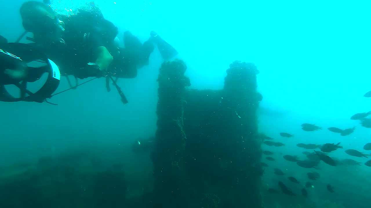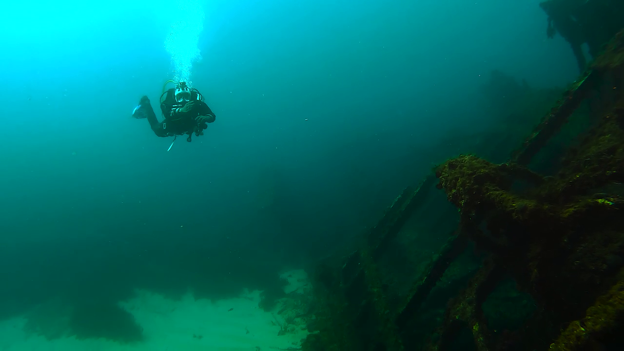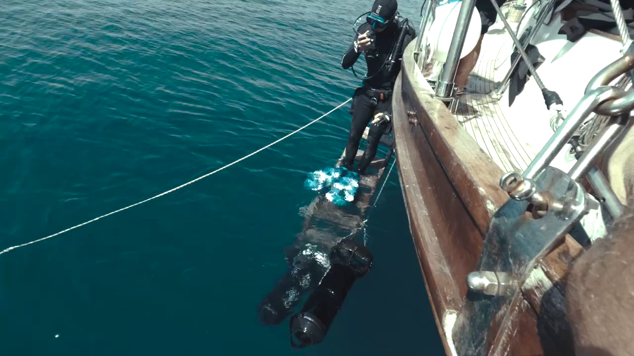 Κατά τη διάρκεια της κατάδυσης, η ομάδα εντοπίζει και απελευθερώνει έναν σαργό που παγιδεύτηκε στα δίχτυα του ναυαγίου — μια στιγμή που θυμίζει πως η φύση βρίσκει τον τρόπο να επιβιώνει ακόμα και μέσα στα κατάλοιπα του πολέμου.