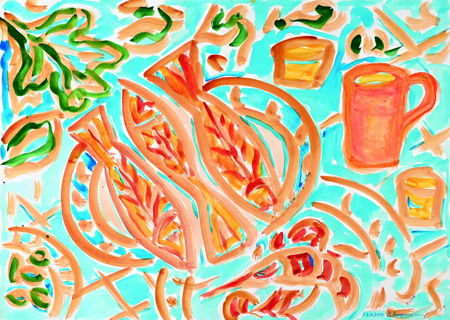 Μέσα από ενότητες έργων όπως τα «Τραπέζια», οι «Χαρτοσακούλες», τα «Ερωτικά» κ.ά. αναδεικνύεται μια ζωγραφική «αυτοβιογραφική, χωρίς ποτέ να γίνεται αυτοαναφορική, που κάνει τον θεατή συνδαιτημόνα» και αναδεικνύει τις τεχνικές, τις υφές, τα χρώματα και τα υλικά που χρησιμοποιεί ο καλλιτέχνης. Από τη μεριά του, ο Αντώνης Καστρινάκης εξήγησε πως «μου αρέσει το καλό φαγητό, η συντροφικότητα, το να μοιράζομαι – γι’ αυτό και τα τραπέζια είναι ένα θέμα που εμφανίζεται συχνά στη δουλειά μου».